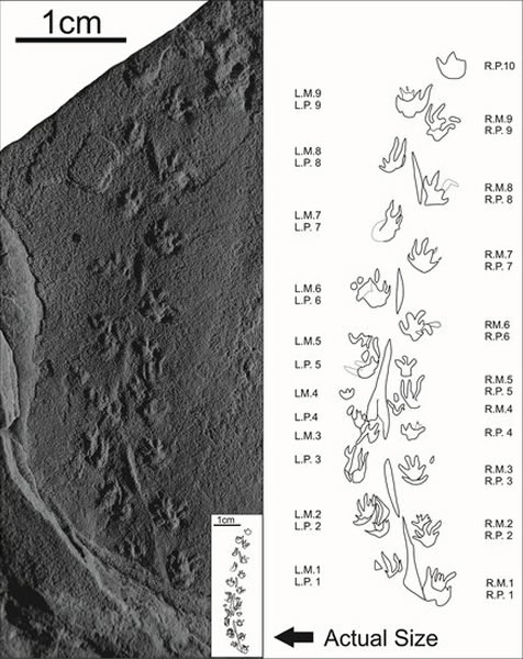 梅兰逊发现这30个足迹中前足的尺寸只有1.6毫米(0.06尺寸)长而后足长度为2.4毫米(0.09英寸)。研究人员在上个月的《Ichnos》杂志中描述她的发现时称这些足印可能属于一种古老的两栖动物,比如说离椎亚目或者小鲵目,从鼻子到尾巴的尺寸只有8毫米(0.3英寸)。