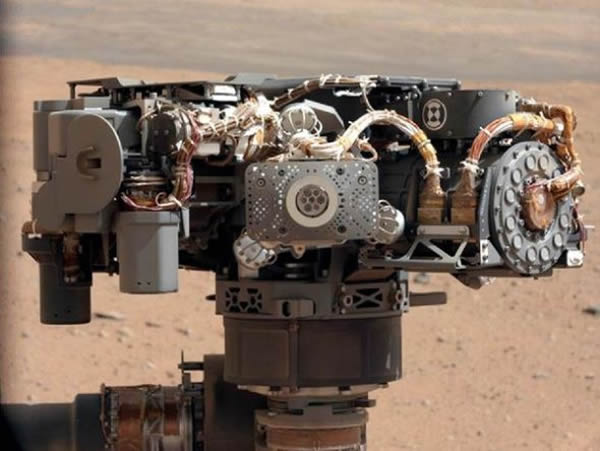 第32个火星日,即9月7日到8日拍摄的“好奇”号火星车机械臂末端的转动架的近照,位于前面和中间的是α粒子与X射线分光仪。这张照片是用“好奇”号上的桅杆相机成像系统拍摄的,它显示的是这辆火星车背后的土壤