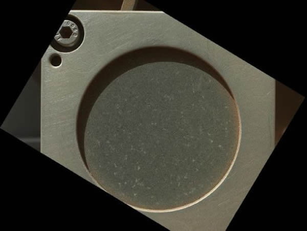 从新墨西哥熔岩流获得的玄武岩样本,它在“好奇”号上充当色导表。这张直径1.4英寸(3.5厘米)的色导表的照片,是由火星手持透镜成像仪9月9日拍摄的