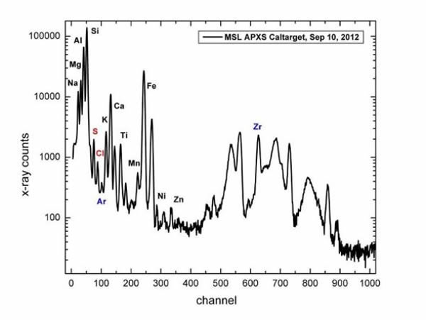 这张图显示的是α粒子与X射线分光仪从它的色导表获得的数据。峰值表明各种成分非常丰富,其中包括在火星大气里发现的氩、该仪器自身的锆,以及火星土壤微粒所含的硫磺和氯
