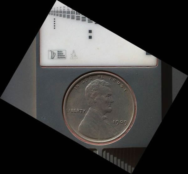 火星手持透镜成像仪相机拍摄了色导表的这张照片,它包括一枚1909年铸造的美分。火星手持透镜成像仪的主要调查员肯-埃杰特强调,要注意林肯耳朵下面和1909这个数字的第一个“9”下面的斑点,那是火星物质