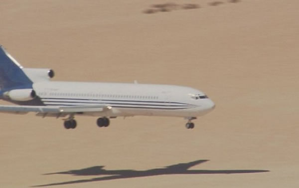 波音727客机在地面控制人员操纵下接近坠毁,图中可见头等舱机身处断裂