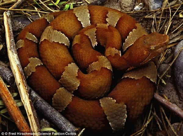 美国铜斑蛇,学名“Agkistrodon contortrix”,具有毒性,但对人类通常不具有致命性