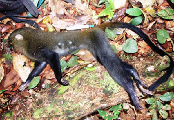 一只死于鹰爪的“lesula”。科学家们得以从贩卖“森林肉”的猎人那里获取了一些样本,再加上这只被目睹死于老鹰袭击的个体。也就是说,在此项研究中,考察组没有去捕捉或伤害任何活着的“lesula”个体
