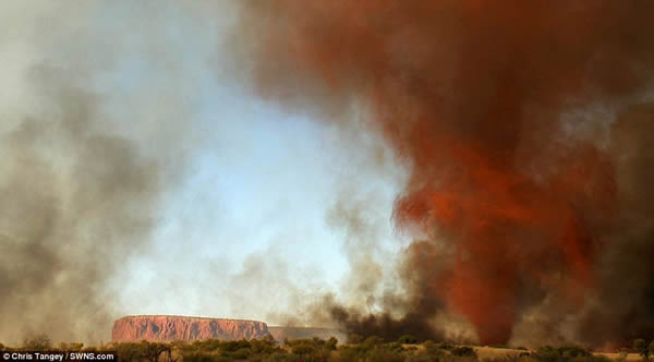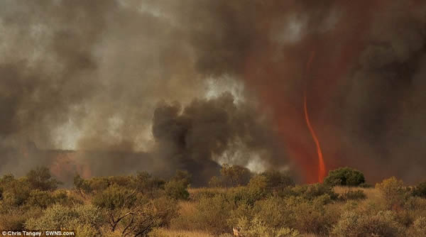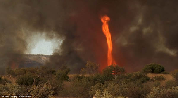 据英国《每日邮报》9月17日消息,52岁的克里斯(Chris Tangey)在澳大利亚艾丽斯斯普林斯(Alice Springs)市的郊外为一部新影片寻找拍摄场地时,用相机拍到了一个30米高的“火龙卷”气旋。
