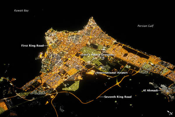 这幅照片是国际空间站上的宇航员于2012年8月9日拍下的。在这幅照片中,灯火辉煌的科威特城与漆黑的波斯湾及人烟稀少的沙漠形成了鲜明对比。