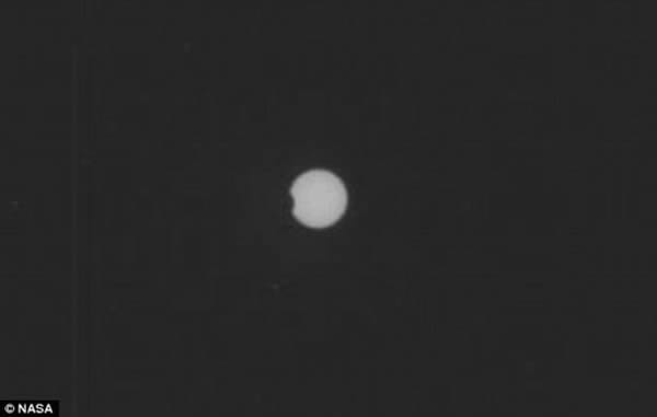 美国宇航局的“好奇”号火星车拍到的日偏食。当时,火卫一在火星与太阳之间穿过