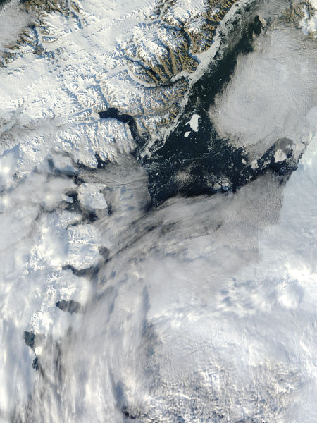 美国宇航局的“大地”卫星于9月13日拍摄到这张真彩色图像,可以看到这座冰山的主要部分和两块较小的碎块。这座冰山沿着皮特曼冰川逐渐崩裂的过程已经被卫星监控了数年之久。皮特曼冰川和其它冰川蜿蜒滑过格陵兰的冰原,就像冰雪的传送带。它们将冰雪从冰原的中心地带运往海边,最终形成巨大的冰山并脱离母体漂浮到海上,最终逐渐瓦解消融。