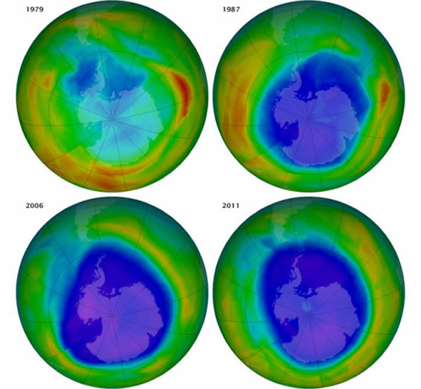 上面的地图分别显示了1979年、1987年、2006年和2011年9月16日(国际保护臭氧层日)的南极“臭氧层空洞”。前两幅地图是根据雨云7号(Nimbus-7)卫星上的臭氧总量绘图系统(TOMS)的观测数据绘制的,其他两幅地图是根据Aura卫星上臭氧监测仪的观测数据绘制的。