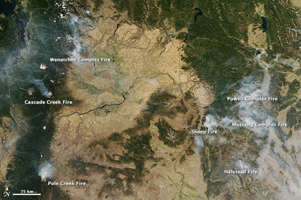 美国宇航局地球观测站公布一组卫星照片,展示了美国西部地区继续燃烧的野火景象。