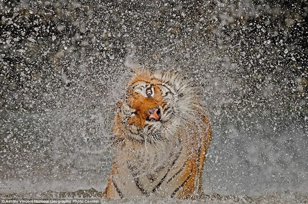 这是泰国绿山动物园中的一头雌性印支虎。这头名为布萨芭的雌性印支虎刚刚从它的私人游泳池中站起来,全身剧烈抖动,试图将身上的水抖干。本图摄影师为阿什利-文森特。