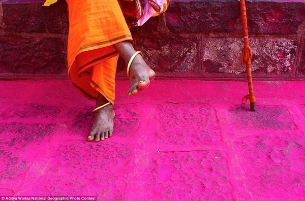 在印度马哈拉施特拉邦一座古庙中,摄影师阿迪提亚-瓦伊库尔拍摄到这一怪异的场景。每逢满月日或星期天,会有大批的皈依者或游客涌入这座古庙,散落的朱砂将古庙的地面染成了粉红色。