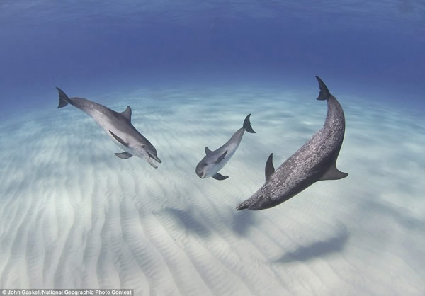 摄影师约翰-加斯凯尔发现三头大西洋斑海豚正在快乐地做游戏,时间长达数分钟。