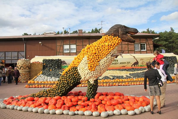 9月23日,在德国小镇克莱斯多夫的南瓜称重大赛现场,参观者欣赏用南瓜装饰的恐龙雕像。