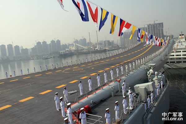 25号上午10点,“辽宁”舰交接入列仪式正式开始。中共中央总书记、国家主席、中央军委主席胡锦涛向海军接舰部队授予军旗和命名证书。中国总理温家宝宣读了党中央、国务院、中央军委的贺电。贺电指出,第一艘航空母舰顺利交接入列,对于提高我军现代化水平,促进国防科技工业技术进步和能力建设,增强国防实力和综合国力具有重大而深远的意义。