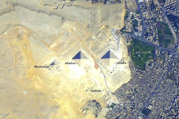 埃及吉萨省首都吉萨市的金字塔名列“古代世界七大奇迹”第七,也是埃及尼罗河三角洲最有名的古代遗迹。这幅照片是国际空间站(ISS)的宇航员使用长焦距镜头数码相机拍下的,其清晰度可以和卫星传感器摄下的照片媲美。