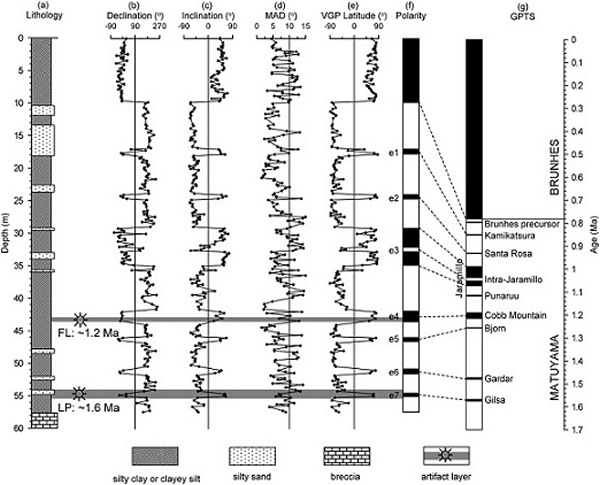 以往在运用古地磁学确定泥河湾盆地古人类遗址年代的研究中,大多基于主要极性带年代的线性插值来获得文化层年代,而主要极性带内的短尺度地磁极性漂移事件并没有较好的应用到古人类遗址定年中来。近日,中科院地球环境研究所敖红副研究员将主要地磁极性带与极性漂移事件相结合,运用地磁极性漂移事件的年代有效约束了泥河湾盆地飞梁和兰坡两处古人类遗址的年代。古地磁结果表明兰坡遗址正好对应Gilsa正极性漂移事件,其年代约160万年;飞梁遗址发生在Cobb Mountain正极性漂移事件的初期,其年代约120万年(图1)。这一研究表明古地磁记录中的短尺度地磁极性漂移事件在古人类遗址定年研究中具有重要应用前景。同时该研究为我国北方在150万前已具有早期人类活动这一观点提供了新的证据。