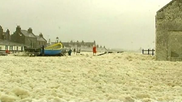 英国苏格兰西岸阿伯丁出现罕见“海浪泡沫”现象 来源: 蜘蛛网 时间:2012年9月27日 12:36 英国苏格兰西岸阿伯丁出现罕见“海浪泡沫”现象 英国苏格兰西岸阿伯丁近日出现奇景,海水与沙冲刷混和形成罕见的“海浪泡沫”(Spume)现象,覆盖整个渔村的海岸沙滩。 科学家指,“海泡”是由于海中有机物质和藻类,与因大浪被吸入水中的空气产生化学作用,造成“洗衣机效应”,形成大量泡沫。 据悉,这些泡沫对人类的健康无害,需要过一段时间才会自然消失。 中新网9月27日电 上一篇 下一篇 TAG: 英国