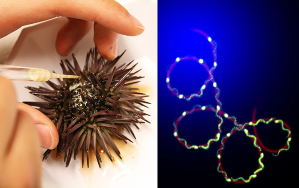 最近,来自位于德国波恩的欧洲高级科技研究中心的科学家们找出了海胆精子是如何利用“化学趋向性”来确定航行路线的。发表在近期《细胞生物学杂志》上的研究报告称,参与研究的科学家发现海胆的卵子能够释放一种小分子的名为呼吸活化肽的物质,这种物质会绑定到海胆精子尾部或鞭毛的受体蛋白质上。这就允许钙离子进入细胞,并增加钙对于精子鞭毛摆动的控制能力,从而使得精子出现急转弯或缓慢弯曲。为了更好地理解海胆精子的航行机理,该研究小组将海胆精子放置在微小的空间内,在精确的时间间隔里加入一种呼吸活化肽的修改版本,研究人员拍摄下了精子鞭毛的运动状态,同时也记录下了钙离子的流入情况。研究结果显示,海胆精子在首次试水中——它们确定正确方向之前,呼吸活化肽抽样为0.2秒到0.6秒——趋向呼吸活化肽浓度高的方向。