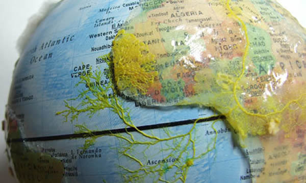 在亚达马斯基的实验中,黏菌逐渐占领了整个琼脂地球仪,路径似乎在模拟人类历史发展之路。