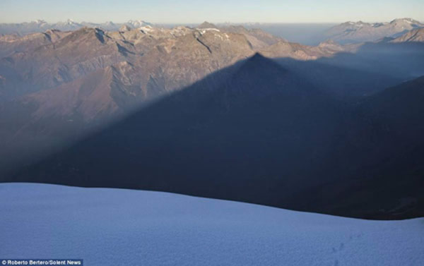 据英国《每日邮报》9月27日消息,近日,意大利的罗西阿梅龙峰惊现由光影产生的“虚幻山峰”,这一神奇时刻正好被摄影师罗伯托(Roberto Bereto)用相机记录了下来。