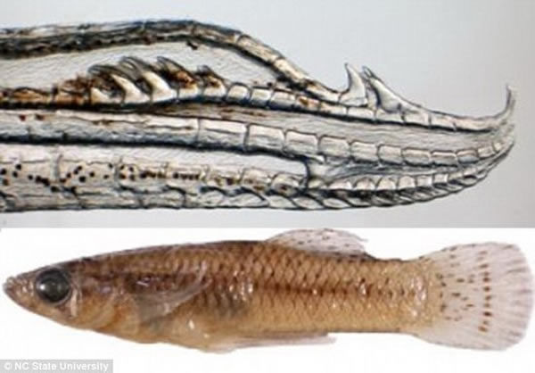 据英国每日邮报报道,目前,美国北卡罗来纳州大学研究人员最新发现一种淡水鱼新物种,它们的古怪特征吸引了科学家,雄性个体的生殖器官上长有4个钩子。