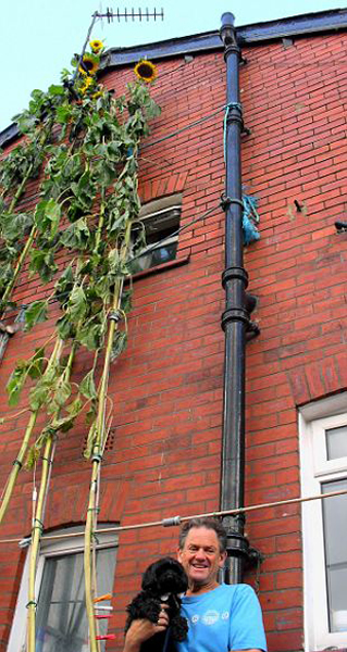 霍普是一名退休的铁路工人,生活在英格兰威根镇。他日前对外界透露了自己种出这种巨大向日葵的秘密武器——施有机肥料。另外,他每天花数小时照料它们。
