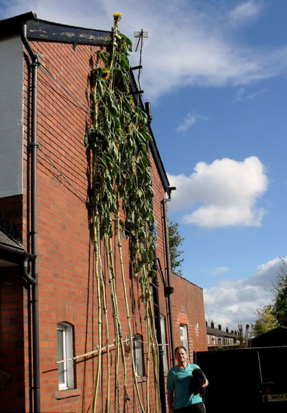 据英国《每日邮报》网站10月5日报道,向日葵在阳光充足的条件下长势较好,而英国夏季多雨潮湿,对向日葵来说,这种外部环境并不算好,不过霍普种在自家房屋旁的向日葵却长到了比两层楼还高。