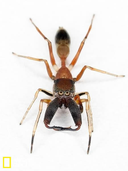 这种大牙蜘蛛发现于京纳巴鲁山地区。研究人员介绍说,“这种未知物种拥有罕见的长牙。通常这种长牙主要用于捕食,但在某些情况下它们也可以用于求偶或交配。因此,现在还很难说清这一物种长牙的作用。在此次科考过程中,共发现了10到15种跳蛛。”