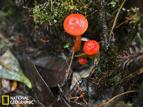这种小型红色菌类也是此类科考发现的数百种菌类之一,它发现于森林地面之上。这种菌类是在夜间被发现的,当时它看起来似乎正发出明亮的光芒。研究人员认为,这种菌类发出荧光主要用于吸引昆虫来帮助它们传播孢子。
