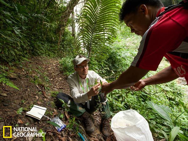 荷兰植物学家弗里德里希-伦斯正在京纳巴鲁山地区采集植物标本。科考队发现了至少一种疑似新物种的秋海棠属植物。这种颜色鲜艳的植物通常被看作是室内植物,其实在京纳巴鲁山茂密的森林中到处生长着各种秋海棠属植物。
