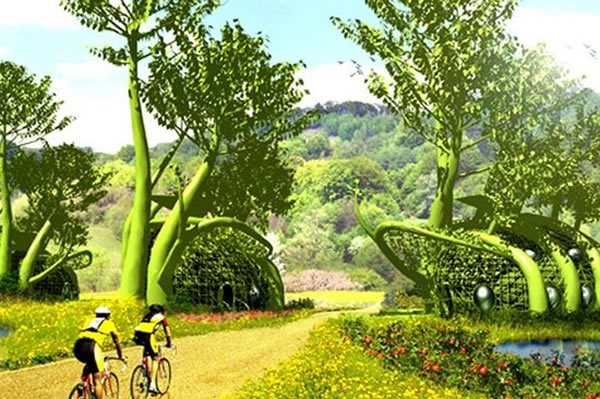 人们将通过在建筑物的框架中种植修剪后的弯曲大树来创建一个新的郊区,那就意味着会长出数千个家庭。约阿希姆解释到:“这样就会使家和大自然混为一体,而且会对生态学产生积极的影响。”蘑菇也能够被人们所利用。约阿希姆描述了活体生物产生生物聚合物的可能性,比如说使用一种生长在框架内的大蘑菇来创造建筑材料模块。这些大蘑菇的层面能够被用于打造成一把椅子,然后再使用皮革一样的传统材料进行包装,完全使用新工艺制作的常见物品能够让人们在未来习惯于使用这种材料的想法。