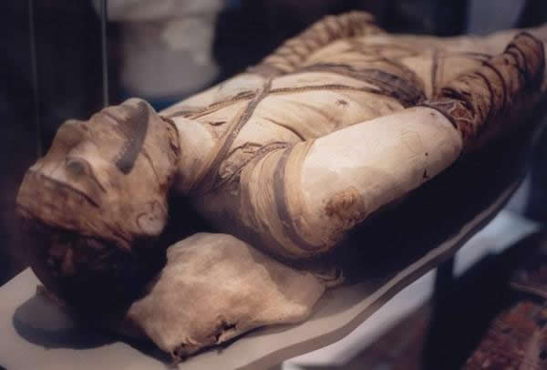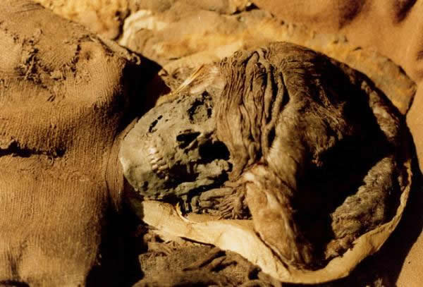 这是埃及法老王拉美西斯二世的遗体。它被认为是世界上保存最完好的一具木乃伊。裹在拉美西斯二世身上的亚麻布上写满象形文字,说明在拉美西斯二世第一次被埋葬在帝王谷后,由于盗墓行为被迫被移动了。这具木乃伊拥有红头发,古埃及红发人与塞斯有关,塞斯是杀死古埃及冥神奥西里斯的神。