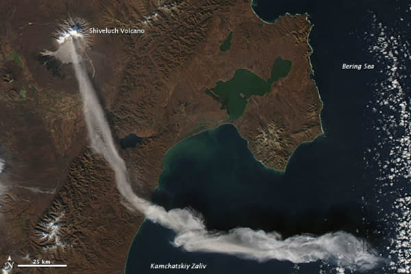 美国宇航局地球观测站公布了一组卫星照片,展示了俄罗斯堪察加半岛舍维留奇火山(Shilveluch Volcano)爆发的景象。