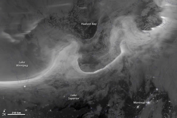 照片中的北极光环横跨加拿大魁北克省和安大略省上空,是一个极光卵形带的一部分。由于地磁风暴的影响,这个极光卵形带延伸到了中纬度地区。