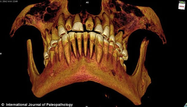 研究人员通过CT扫描图片观察木乃伊的口腔,并重建了一张显示磨损门牙的3D图。