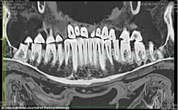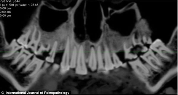 《古病理学国际期刊》的文章称,来自加拿大西安大略大学的安德鲁·韦德利用一种新型高分辨率CT仪扫描木乃伊的牙齿和身体,并且根据扫描片重建了3D图以进行更为细致的研究。从CT扫描片可以看到,木乃伊的一颗牙齿龋洞里塞着一块亚麻布团。这块亚麻布之前可能经过无花果汁液或雪松油等药物的浸泡,随后被塞入下颚第一、二颗臼齿中间,也就是最大、也是最疼的龋洞里。这么做既能起到抵挡食物残渣进入龋洞的屏障作用,又能利用亚麻布上的药物缓解疼痛。