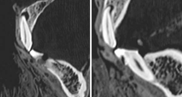 CT片显示了木乃伊左边第一颗门牙(左图)和右边第二颗门牙(右图)的磨损状况。