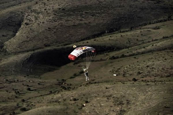 在成功着陆后,他跪在地上,胜利地举起了拳头