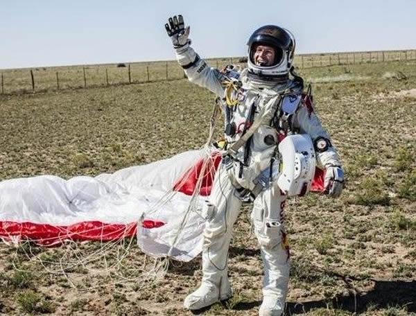 完成宇航服加压后,这位极限运动员头部向下纵身跳向地球,按照预测,其下降速度在短短40秒内可从0飙升至1120公里/小时,超过了音速。在距离沙漠着陆点只有最后1500米时,他打开降落伞,并最终成功着陆。