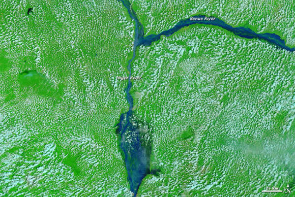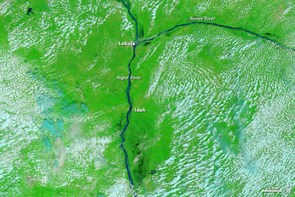 2008年是尼日利亚一个相当典型的枯水年,尼日尔河和贝努埃河河道细小如辫,周围的泛滥平原上点缀着一些池塘和湖泊。而2012年,尼日尔河和贝努埃河河流决堤,吞没了周围小湖泊和池塘。在伊达(Idah)地区南部,尼日尔河膨胀成一个庞大的临时湖泊。
