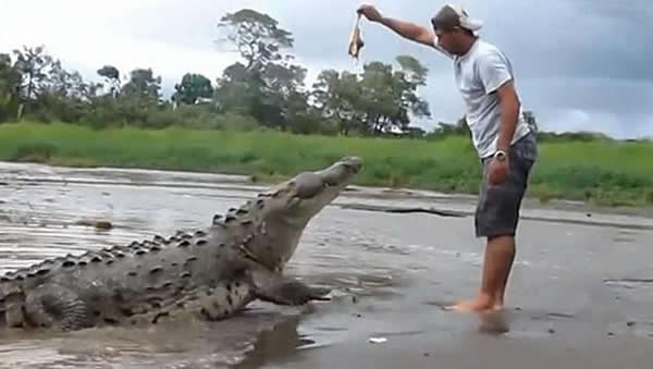 据美国《纽约每日新闻》10月16日报道,近日,LiveLeak视频网站上出现一段长约70秒钟令人毛骨悚然的视频。视频中,哥斯达黎加的一位导游用一小块肉作诱饵,在一条饥饿的巨大鳄鱼面前来回晃动,进行挑逗。为了得到食物,这条鳄鱼差点将这名导游的胳膊咬去。
