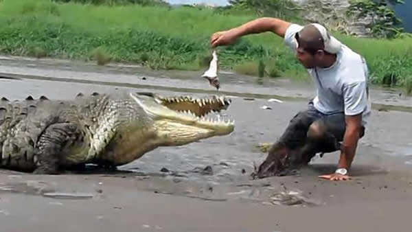 为了给旁观者留下深刻的印象,该导游一边在鳄鱼的面前晃动手中的诱饵,一边朝岸边的淤泥退去。后退中,他突然跌倒在淤泥中,而此时鳄鱼正朝他爬来。幸运的是,他最终站了起来,而且未受到鳄鱼的攻击。