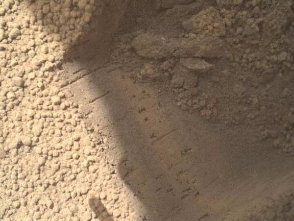 这张照片帮助美国宇航局的科学家们判断这些浅色物质颗粒应当是火星原生物质而非外来物质。而附近的其它一些浅色物体经过确认则已经被确定为好奇号火星车降落时溅落的材料碎屑物
