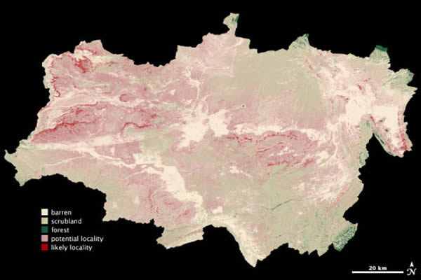 美国宇航局地球观测站公布了一张通过计算机人工神经网络识别的美国怀俄明州大分水岭盆地土地覆盖图,显示了该地区可能存在化石的地点。