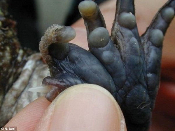 日本发现一种罕见青蛙 来源: 蜘蛛网 时间:2012年10月20日 13:52 日本发现一种罕见青蛙 这种青蛙蹼上长有尖刺 日前研究人员在日本发现了一种罕见的青蛙,这种青蛙的蹼上长有一根尖锐的刺。研究人员分析,这根刺一般用于打斗和交配。 据报道,这种青蛙的蹼与其它青蛙蹼的形状不同,同时,在蹼的侧面还长有一根锐利的尖刺。研究人员称,雄性青蛙的刺要比雌性的刺更长,但只有雄性青蛙的刺才被用来打斗和交配。 研究人员说,雄性青蛙身体上的伤痕显示,它们常把尖刺作为武器打斗,用以争夺地盘和配偶。在交配时,雄性青蛙也会使用这根刺“固定”雌性青蛙。 中新网 上一篇 下一篇 TAG: 青蛙 日本