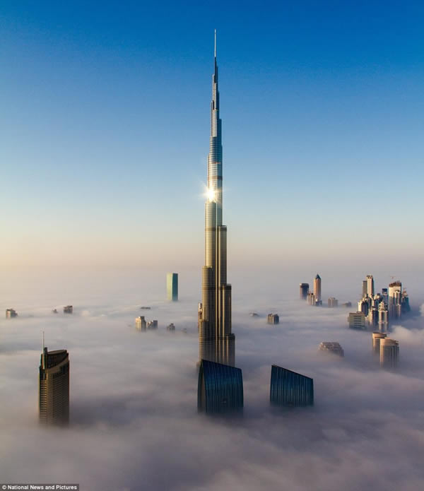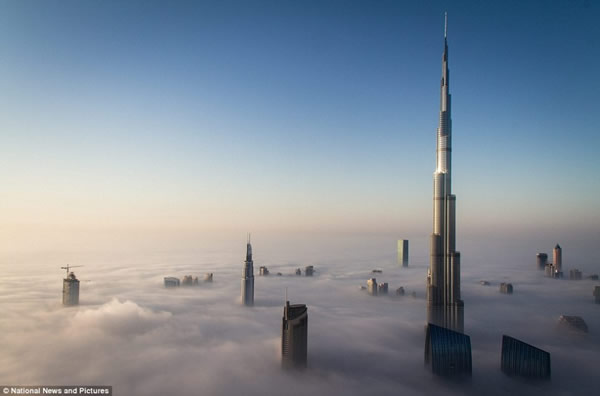 世界第一高楼——迪拜的哈利法塔被雾海环绕的壮观景象