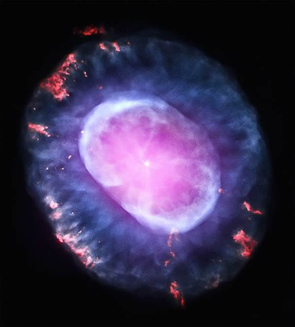 这张NGC 7662星云和其它数十个最近由钱德拉X射线望远镜所拍摄的行星状星云图像让我们可以想象太阳在数十亿年之后的可能景象。一颗和太阳相类似的恒星,一旦其核心的氢燃料耗尽,它就将膨胀为一颗巨大的红巨星,并开始向外抛射其气体外壳。在这些明亮的气体外壳内部,恒星内部收缩为一颗白矮星。