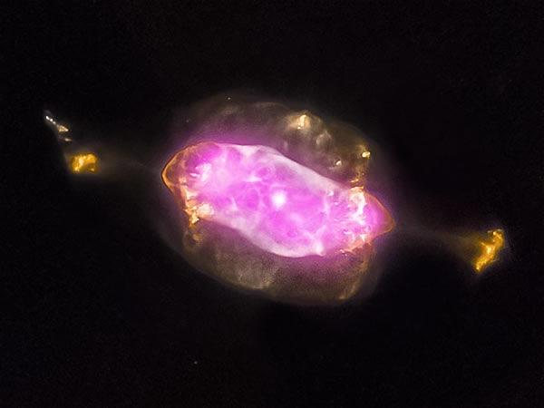 卡斯特纳表示:“当我们注视着这些紫色的迷幻般的光芒时,有一点是可以肯定的,那就是我们可以观测到从内部高速抛射而出的物质流追上并撞击先前被抛出的气体物质壳的情景。”