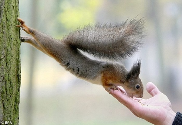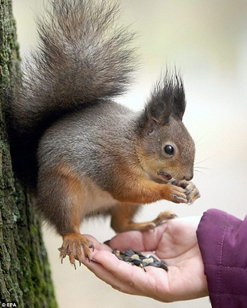 据报道,这只贪吃的松鼠生活在白俄罗斯首都明斯克的中央公园。为了吃到坚果,这只松鼠不顾“危险”,爬下树站在一位女士的手上大嚼起来。在吃完坚果后,这只松鼠似乎还不满足。正好另一名男子又前来喂食,它随即又爬下树,在男子手中吃起东西来。
